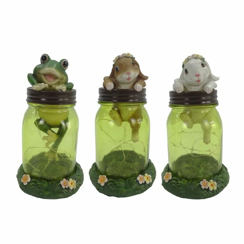 Illuminate your outdoor garden scenery with Alpine’s backyard animal LED light jar décor. Beautiful to look at during the day, this trio featuring a frog and two rabbits climbing out of glass jars will look spectacular on a porch, deck, yard or in a garden! This beautiful decorative animal motif features 10 warm white LEDs and a 6 hour timer. Relax and enjoy!