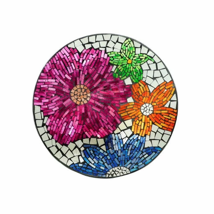 Gorgeous 18″ diameter metallic glass mosaic bird bath is uniquely designed in the shape of colorful flowers Includes a metal stand.