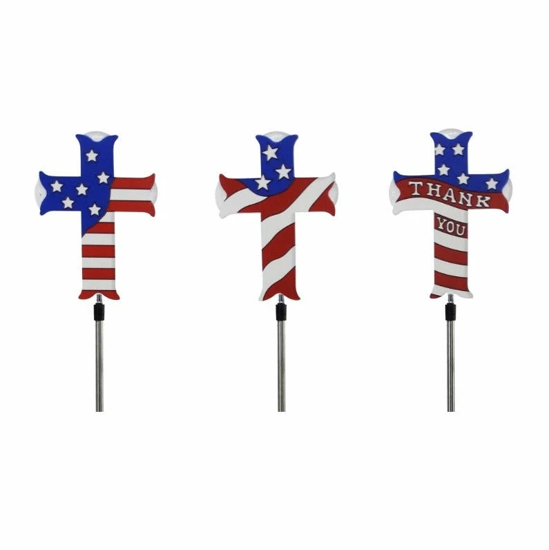 A great way to remember a loved one with this solar patriotic cross garden stake! Designed with red, white and blue stars and strips, this stake needs no electricity. Charge by day and it lights up by night!