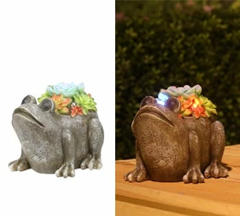 These whimsical animal statues feature succulent accents and solar powered LED lights. Works for up to 8 hours on a full charge