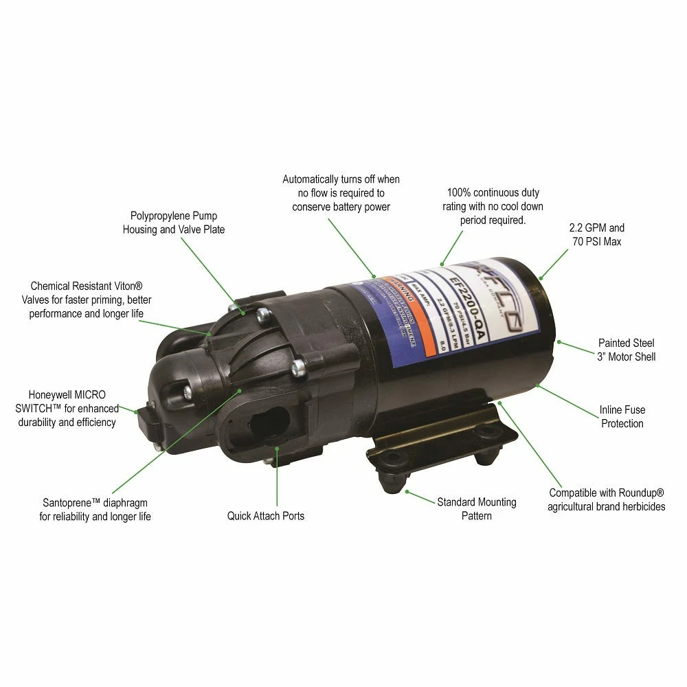 When it comes to spot and broadcast spraying, the Everflo 12V 2.2 GPM Quick Attach On-Demand 12 Volt Diaphragm Pump is the king of the hill. With premium components and cutting-edge engineering, Everflo provides the flow you need. This pump is loaded with features such as a Honeywell Micro Switch, corrosion resistant Viton valves and Santoprene diaphragm and fiberglass-reinforced polypropylene pump manifold with quick attach ports. Other features include a silky smooth valve design for faster primes and a unique pressure switch that slowly cycles the pump to reduce wear on the motor and switch. Save battery power with the automatic power switch that turns off pump when no flow is needed. Includes 1/2″ MNPT and 3/8″ hose barb fittings for connection flexibility. Approved for use with Round-Up and other agricultural brand herbicides and insecticides. CE approved and has standard mounting pattern to fit most sprayer tanks.