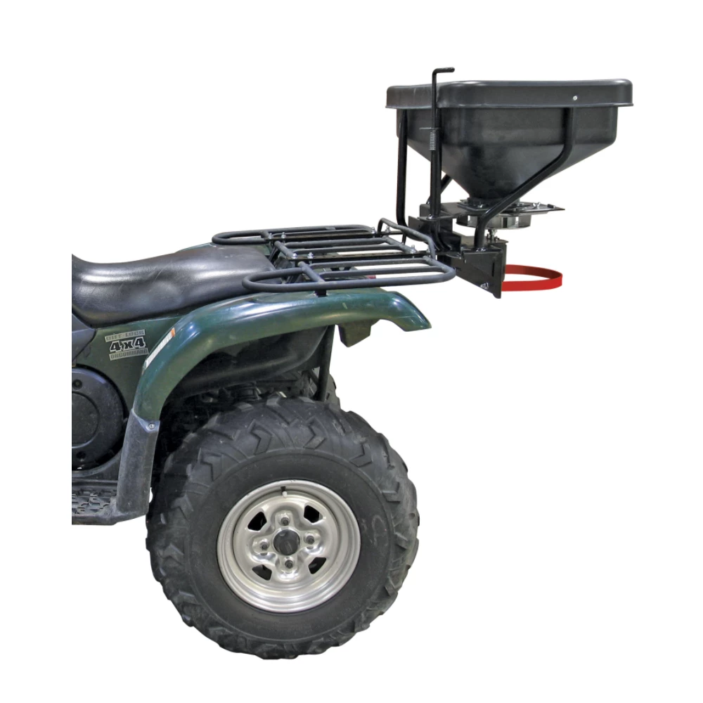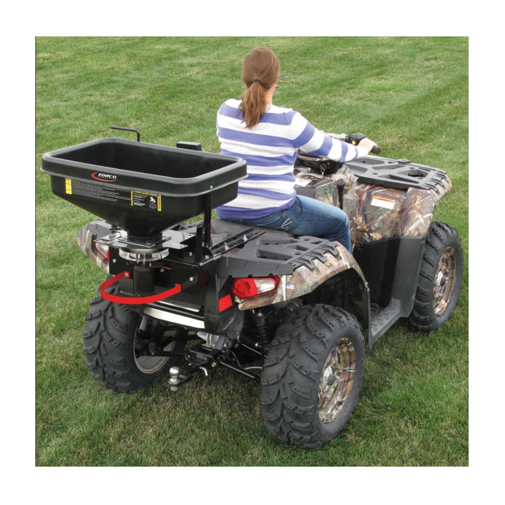The FIMCO ATV Dry Material Spreader easily disperses seed, dry granular fertilizer, pesticides, ice melt and other dry materials. Spreader includes mounting brackets to attach to most standard ATV cargo racks and bolts to dry material spreader frame. You can also purchase an optional 2 inch hitch mounting bracket for larger UTV and standard pickups. The 12 volt motor with variable speed control allows you to vary the spread width from 5 feet to 45 feet. Versatile and easy to use, the FIMCO ATV Dry Material Spreader features a 2.2 cubic foot capacity poly hopper that holds up to 145 lbs of material and a stainless steel radial 6 blade fan.
