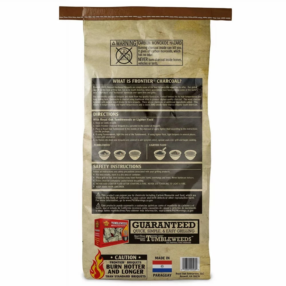 Frontier brings the world to your backyard! Add some excitement to your grill with Frontier South American Briquets. South America is known around the world for some of the best barbecue and charcoal. Frontier Briquets are sustainably produced in South America made from Quebracho wood, famous for its high temperatures and long lasting heat.