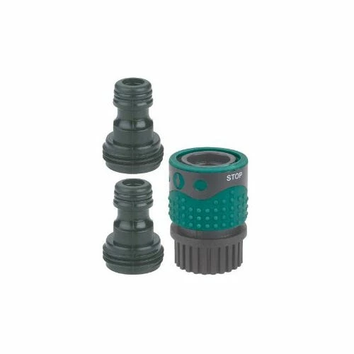 - Set includes 1 female hose end connector with automatic water shut-off and 2 male hose end adapters.