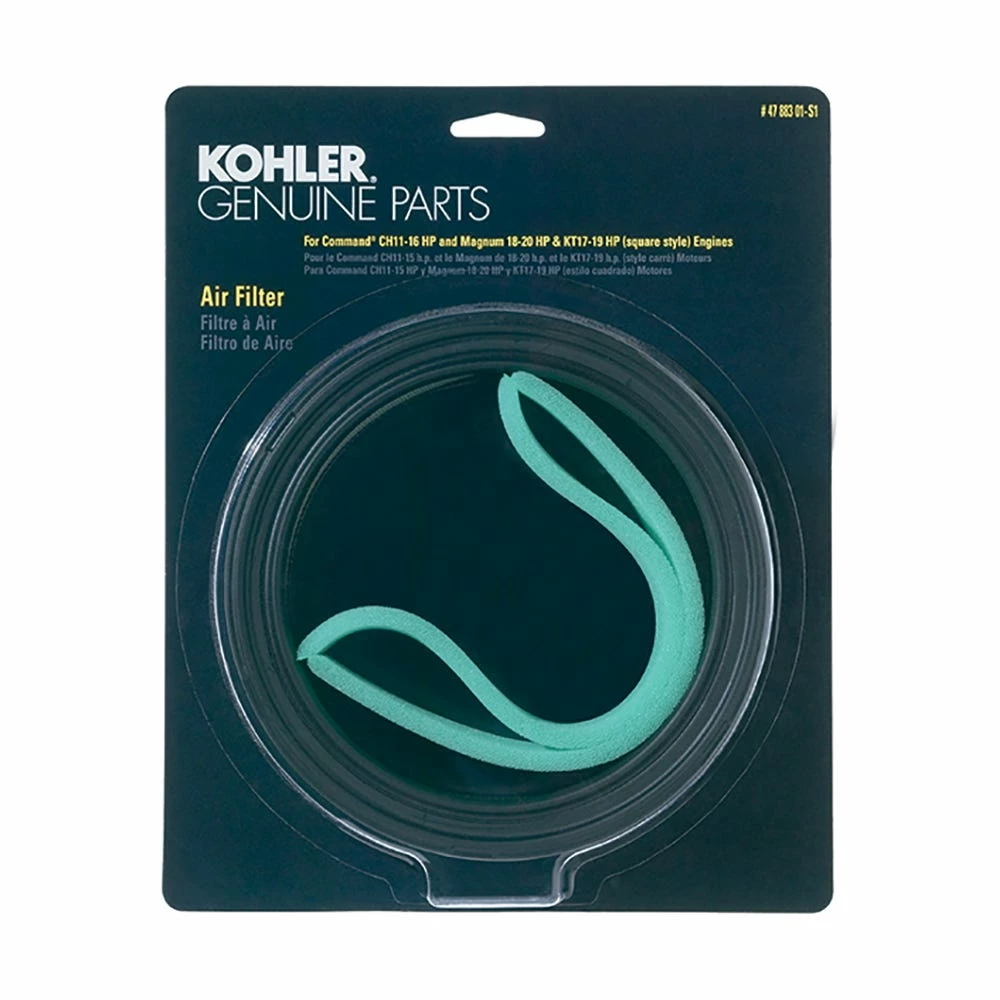 The Kohler 47 883 01-S1 Engine Air Filter/Pre-Cleaner Kit for CH11-16, Square Style KT Series is just what you need. The pre-cleaner/air filter kit is ideal for replacing worn out or broken parts. The Kohler air filter fits Command, Magnum and K-Series. Engine air filters are important for keeping dirt and debris out of engines.
