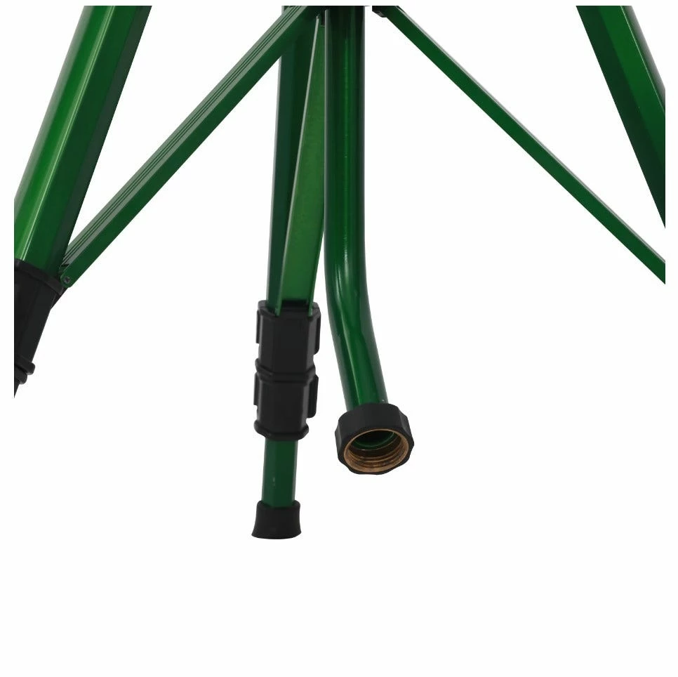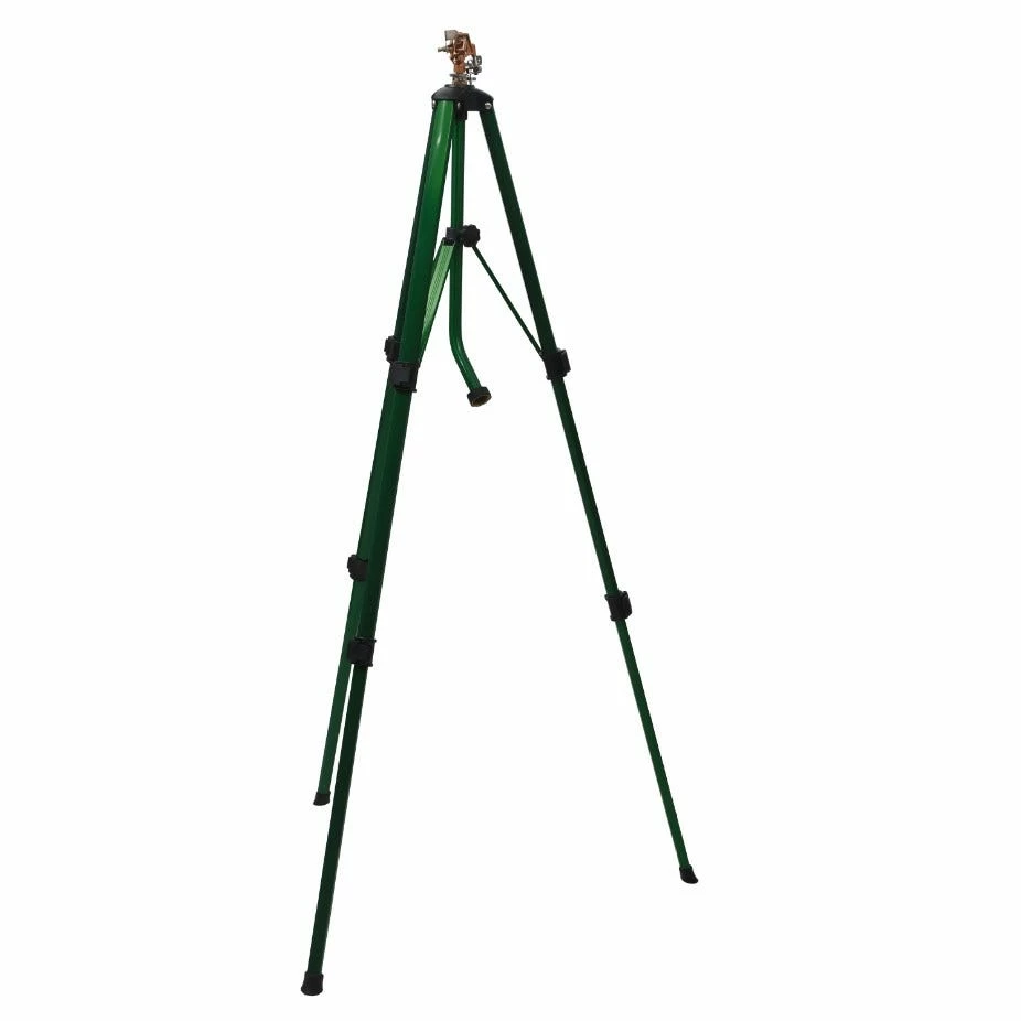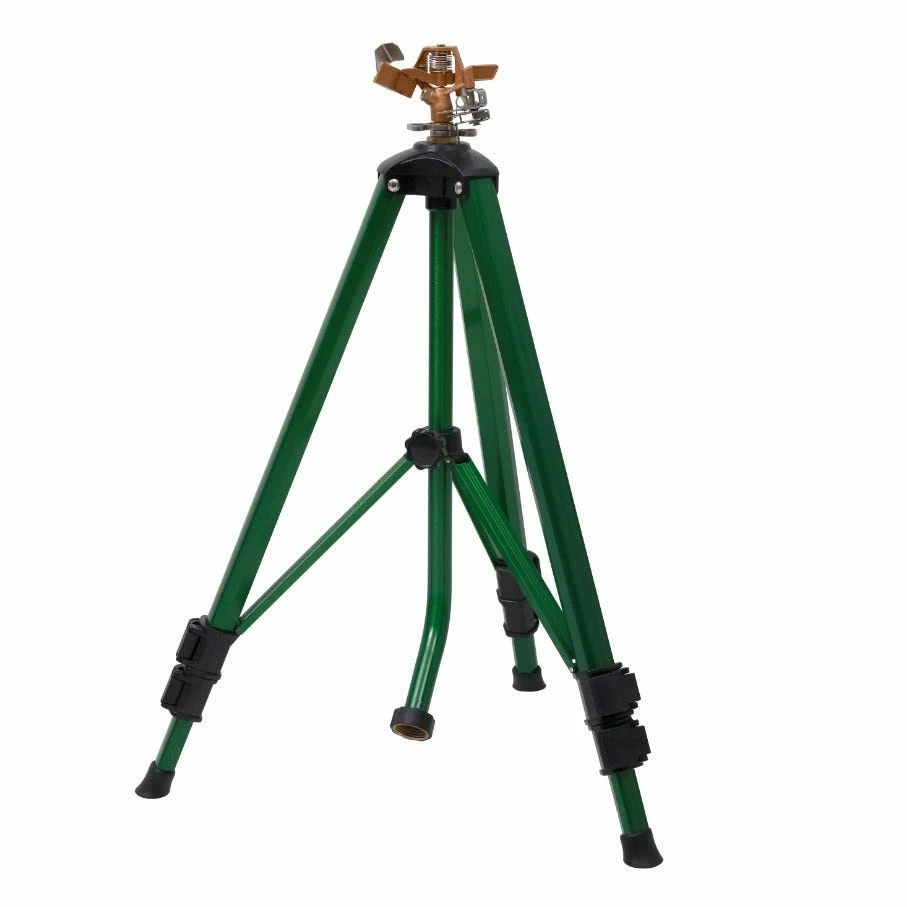 The Brass Tripod Sprinkler from Maple Ridge is ideal for large areas, and sits on a tripod to reach above vegetation. The adjustable pattern can easily go from a few degrees to 360.