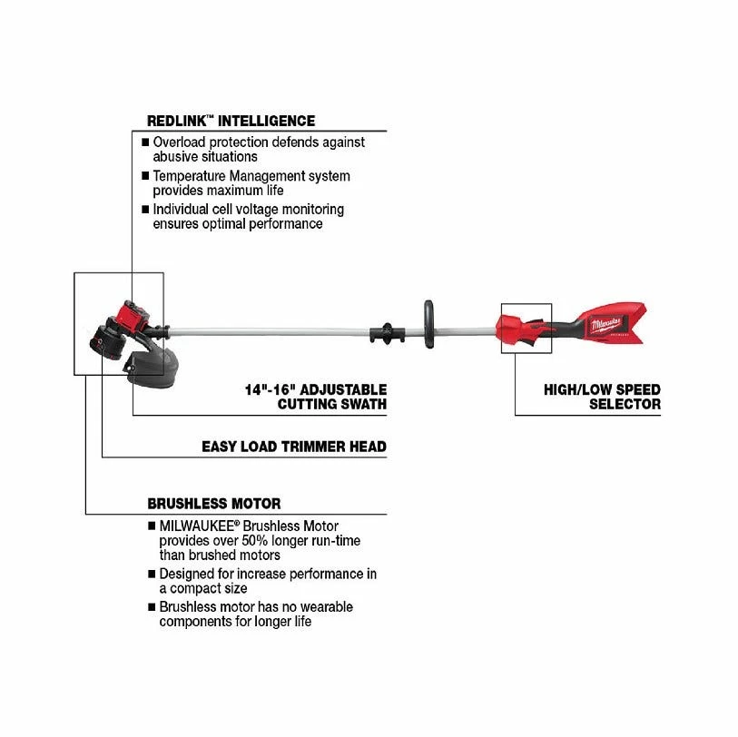 The MILWAUKEE® M18™ Brushless String Trimmer delivers more clearing power and a larger cutting swath than battery-powered competitors. The brushless motor was built and optimized specifically for trimming applications and provides up to 6,200 RPM. Paired with REDLINK™ Intelligence and an M18™ REDLITHIUM™ HIGH OUTPUT™ battery, the trimmer provides efficient power delivery allowing for longer run-time. The trimmer features high and low speed settings with a variable speed trigger. High-speed provides the power to take on demanding applications, and low-speed maximizes run-time while having plenty of power for grass trimming. The 16″ cutting swath trims more grass in a single pass, which increases productivity. The Easy Load Trimmer Head delivers an easy line loading experience and the ability to load up to 25′ of trimmer line in under 30 seconds. This cordless string trimmer is a part of the M18™ System, which is fully compatible with over 200 solutions.