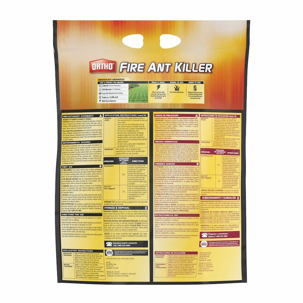 Protect your lawn from fire ants with Ortho Fire Ant Killer Broadcast Granules. It kills fire ant mounds in 15 minutes and protects your lawn for up to 6 months. Don’t treat just the infested areas where mounds are visible, treat your entire lawn to control reinfestation of fire ants from neighboring areas. For best results apply with a Scotts spreader when ants are most active (morning or late evening) and when temperatures are between 65º and 80º F, and water in after application. Covers 5,000 sq. ft. of residential lawn space. To keep fire ants at bay, use as part of the Ortho 2-Step System – use Ortho Orthene Fire Ant Killer 1 (sold separately) as a first step to destroy existing mounds, then, use Ortho Fire Ant Killer Broadcast Granules to prevent new mounds from forming for up to 6 months. Trust Ortho Fire Ant Killer Broadcast Granules to not just kill fire ants, mounds and queen, but to keep them away as well.