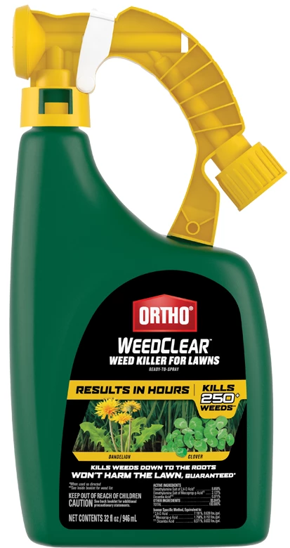 You can kill weeds without harming your lawn* with Ortho® WeedClear™ Weed Killer for Lawns Ready-To-Spray. This weed killer kills over 250 common weeds, including dandelions, clover, poison ivy, chickweed, and dollarweed (see product label for complete weed list). It is made especially for residential lawns and contains three proven ingredients to specifically target and destroy other common lawn weeds, without harming your grass*. This herbicide works by entering weeds through their leaves, and moves throughout the plant to kill all the way down to the root. You’ll see visible results in hours, and it becomes rainproof within one hour upon drying.