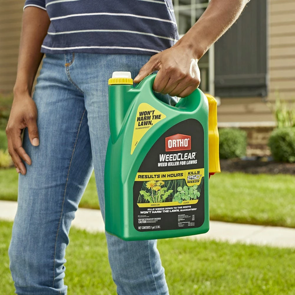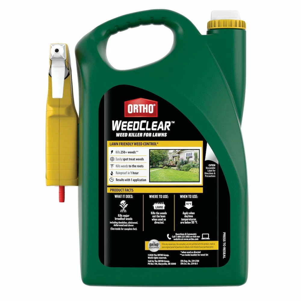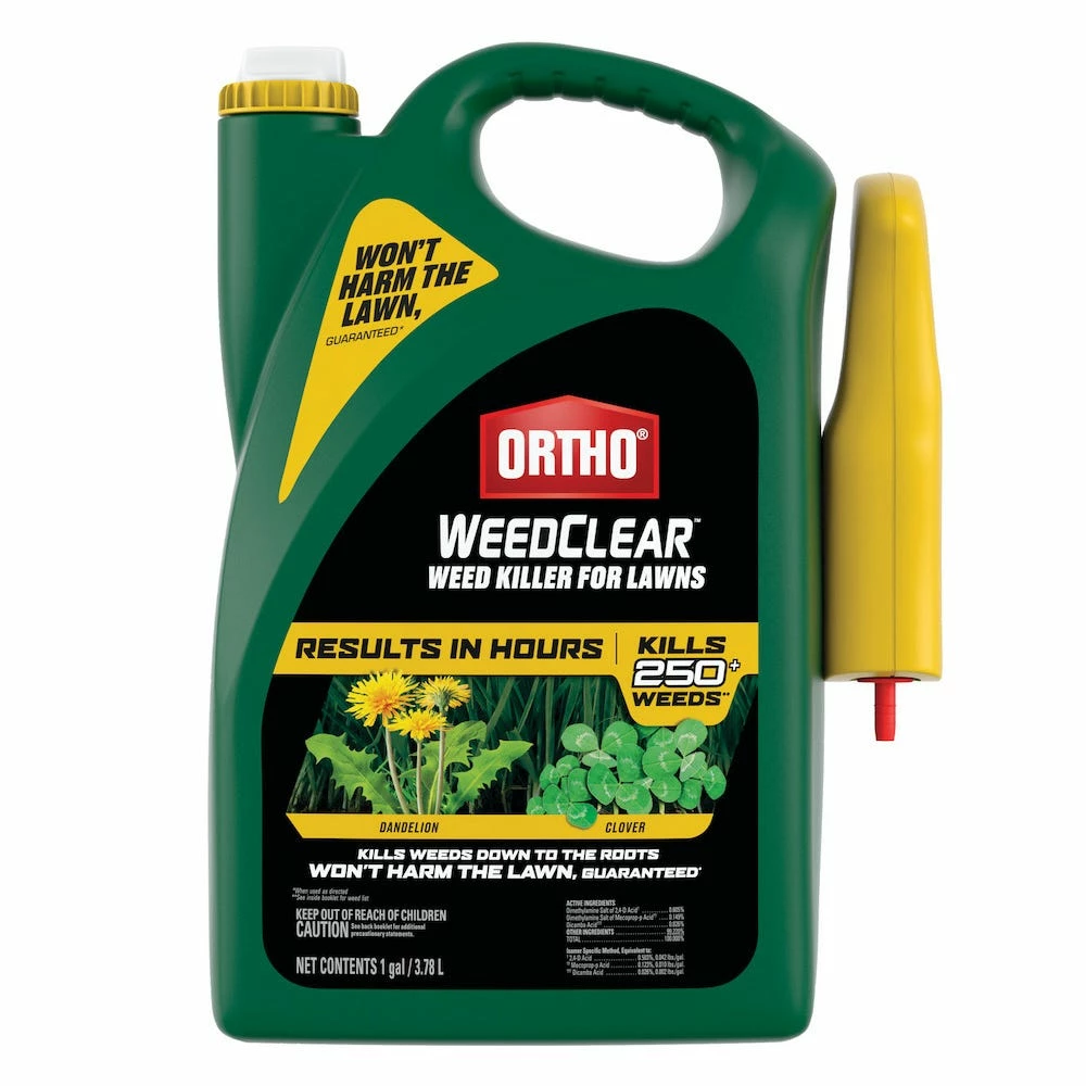 You can kill weeds without harming your lawn (when used as directed) with Ortho WeedClear Weed Killer for Lawns with trigger sprayer. This weed killer kills over 250 common weeds, including dandelions, clover, poison ivy, chickweed, and dollarweed (see product label for complete weed list). It is made especially for residential lawns and contains three proven ingredients to specifically target and destroy other common lawn weeds, without harming your grass (when used as directed). This herbicide works by entering weeds through their leaves, and moves throughout the plant to kill all the way down to the root. You’ll see visible results in hours, and it becomes rainproof within one hour upon drying. To apply, just insert the ready-to-use trigger sprayer (included) and turn the nozzle to your desired setting. People and pets may enter the treated area after the spray has dried. For best results, use when weeds are small and actively growing in the spring or fall.