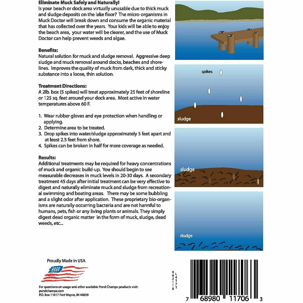 Pond Champs Muck Doctor is specifically formulated for beach and dock areas. Beach and dock areas are often used for many recreational activities and no one wants to sink knee deep in muck and sludge. Muck Doctor will go to work reducing muck levels quickly and safely.