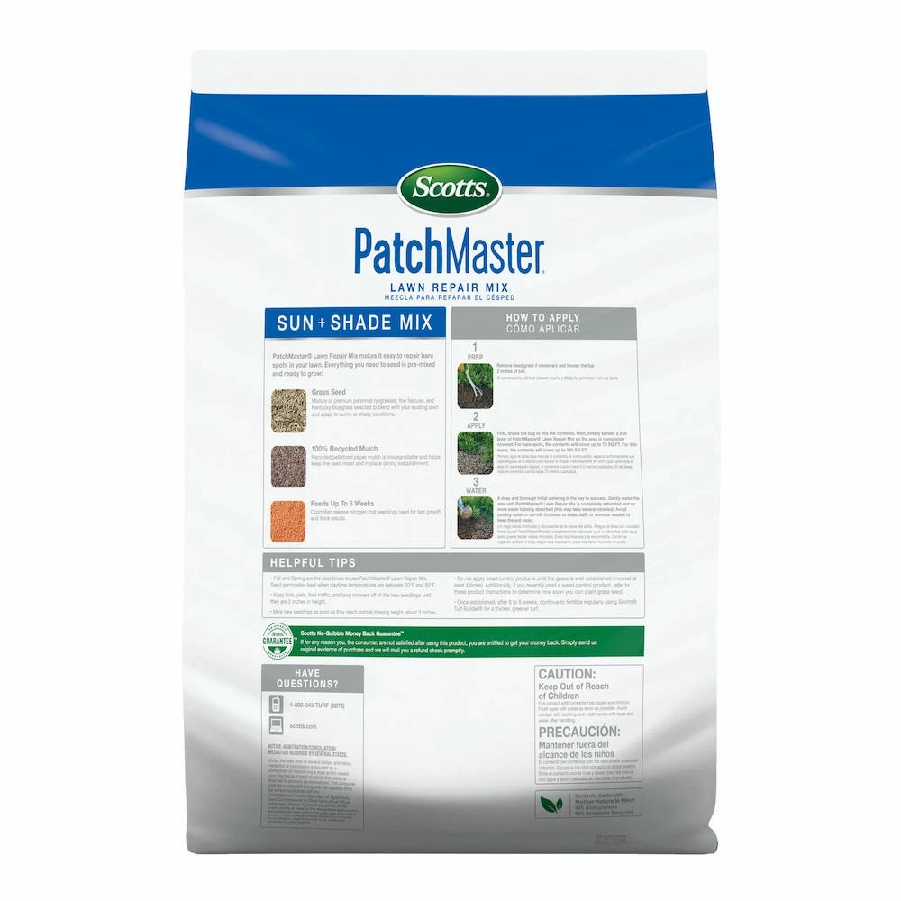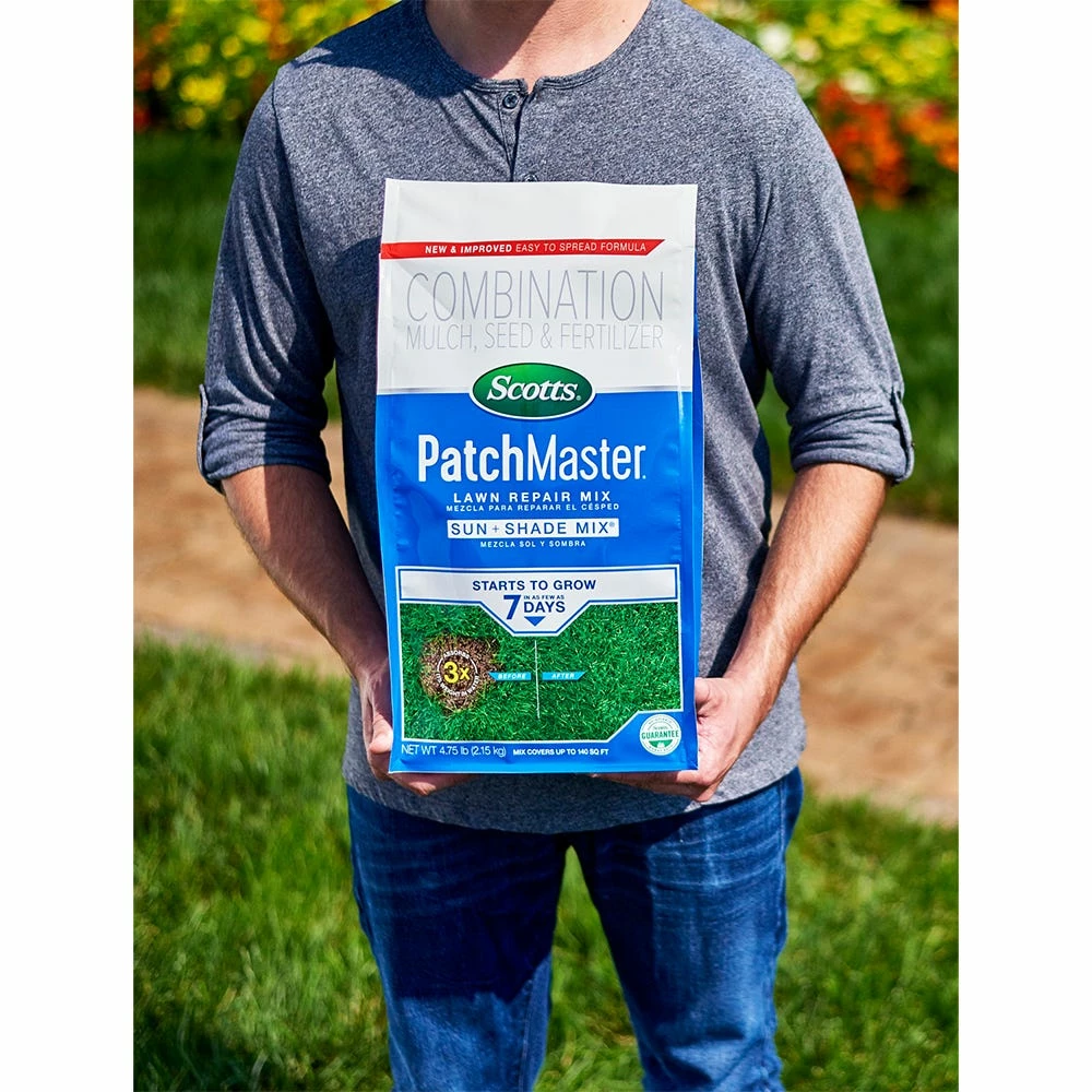 Improved Scotts PatchMaster Lawn Repair Mix Sun and Shade Mix has everything you need to repair bare spots in your lawn. It includes seed, 100% recycled mulch to keep the seeds moist during establishment, and fertilizer to help feed seedlings for up to 6 weeks for fast growth and thick results.