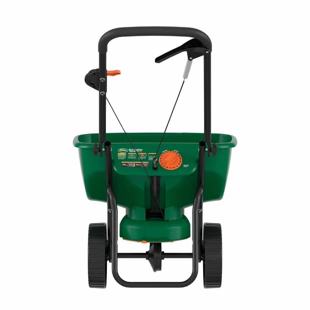 Use the Scotts Turf Builder EdgeGuard DLX Broadcast Spreader to apply fertilizer, grass seed, and other lawn care products. This lawn spreader comes pre-calibrated and ready-to-use, and holds up to 15,000 sq. ft. of Scotts product. When EdgeGuard is engaged, it will block off the right-side of the spreader pattern to prevent product from spreading onto non-lawn areas. Using the Scotts Turf Builder EdgeGuard DLX Broadcast Spreader is simple. To begin, turn rate control dial to the correct setting listed on the back of each Scotts product, pour the product in the hopper, then start spreading. The spreader’s design enhancements feature a curved hopper and dual-bladed agitator for smooth product funneling and consistent coverage. Spreaders provide uniform coverage of granular products; without one, you may end up with uneven coverage of fertilizer or control products that can result in uneven feeding, weed, disease, or insect control. Scotts spreaders can also be used to distribute salt on walkways and driveways.