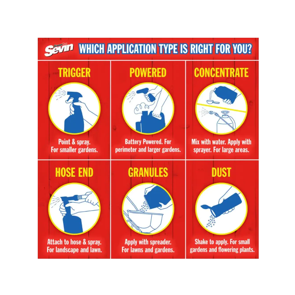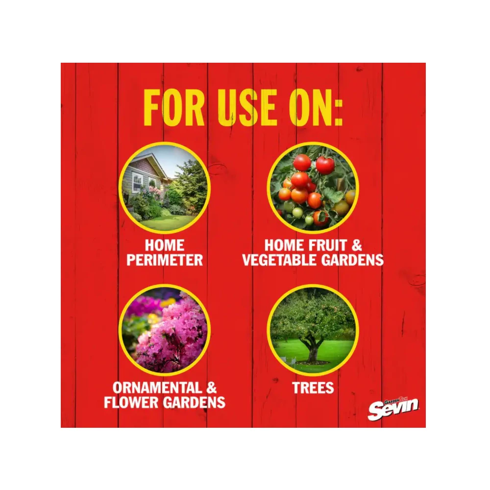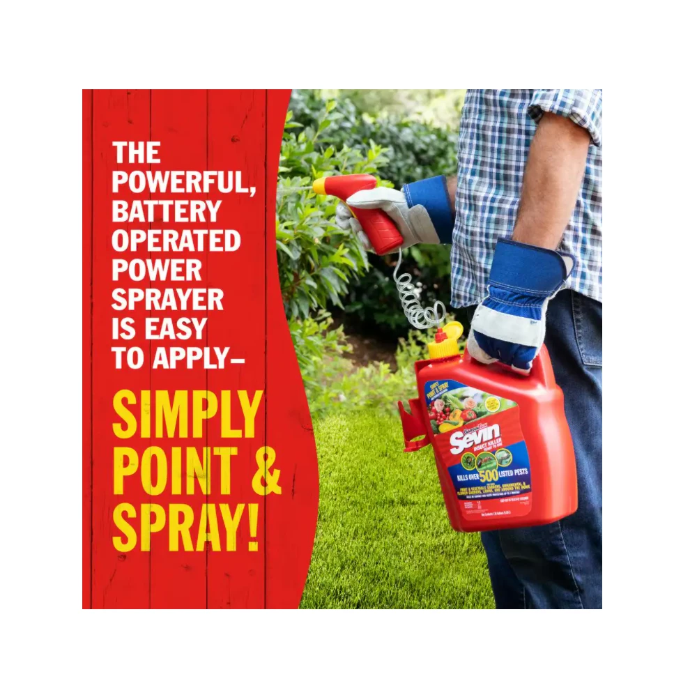 Sevin Ready-To-Use Lawn Insect Killer with Battery Powered Sprayer (batteries included) kills over 100 listed insects on vegetables, fruits and ornamentals. Use the power sprayer to spray thoroughly on all surfaces of plants to control nuisance pests such as fleas, ticks, spiders, Japanese beetles and outdoor roaches. Use in your lawn care throughout the growing season to kill insects with short pre-harvest intervals for edibles.