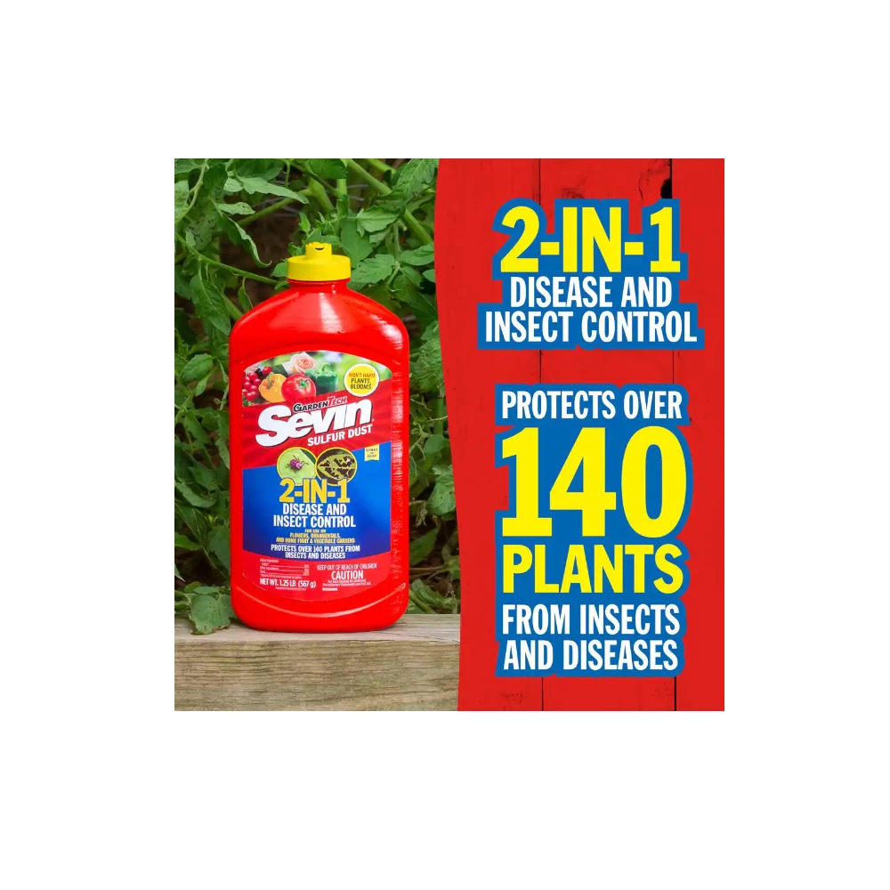 The Garden Tech Sevin Sulfur Dust protects gardens from insect and disease damage. This 2-in-1 pesticide controls over 45 insects and diseases on listed plants. This sulfur dust is the go-to solution when the culprit of plant damage is unknown. This insecticide can be used as a dust or spray, and does not harm plants or blooms on roses, flowers, citrus trees, fruits, vegetables, shrubs, and trees.