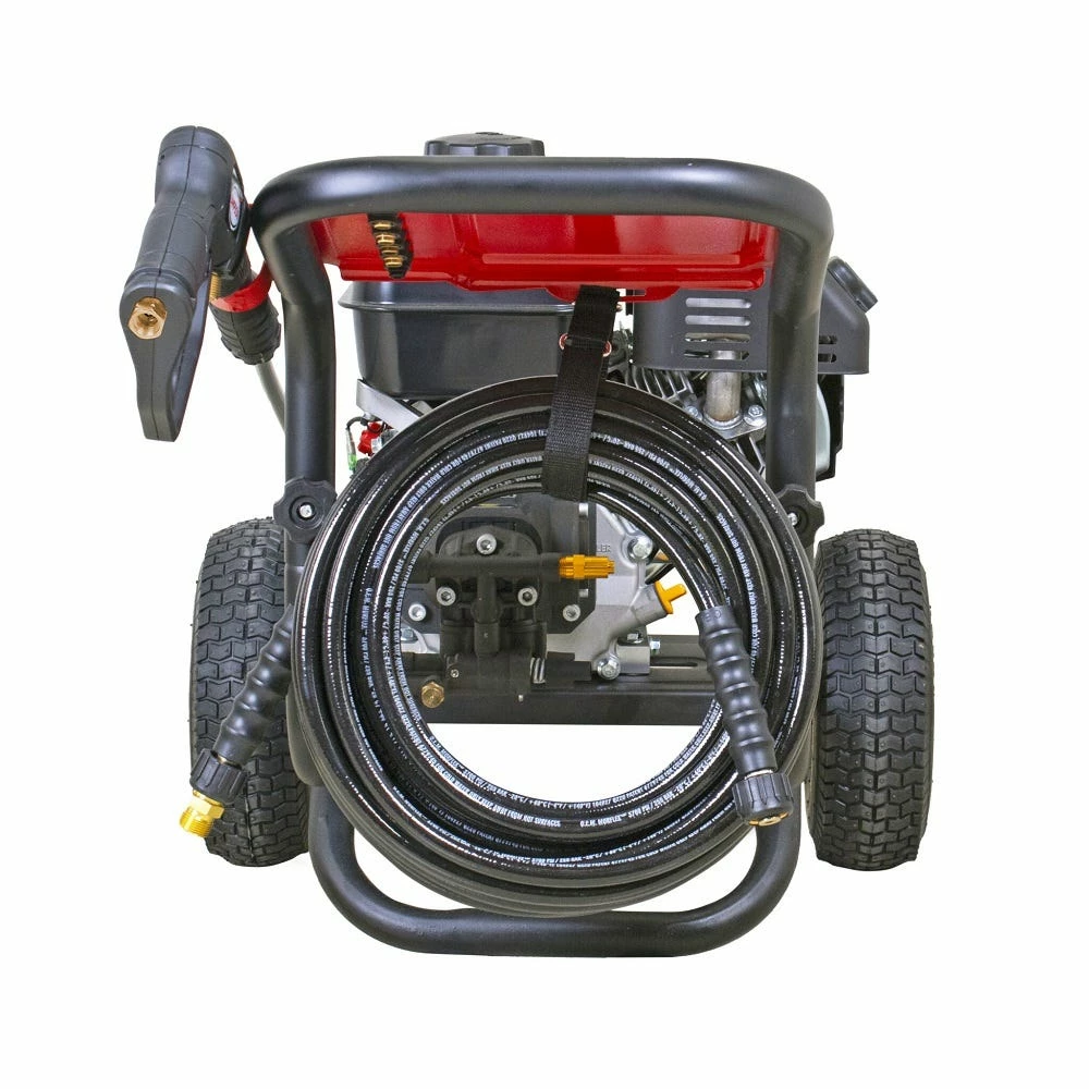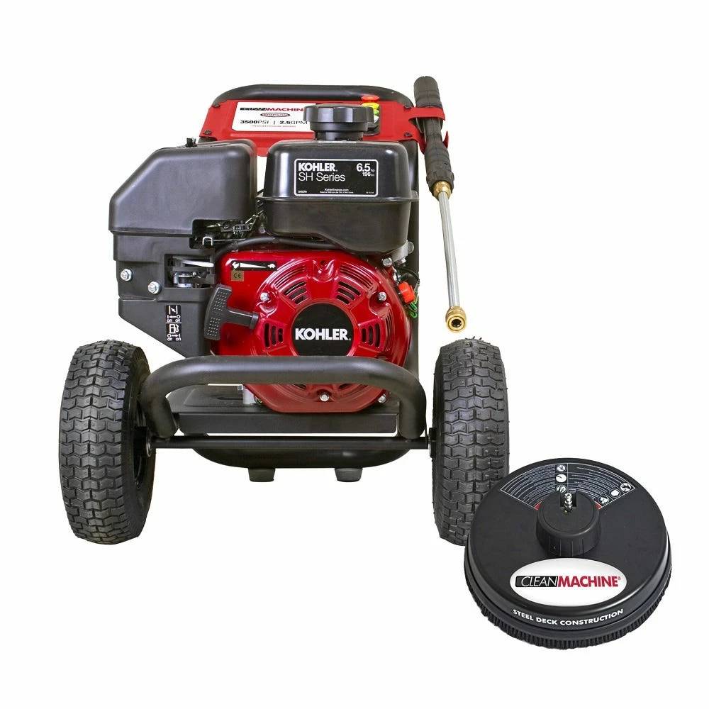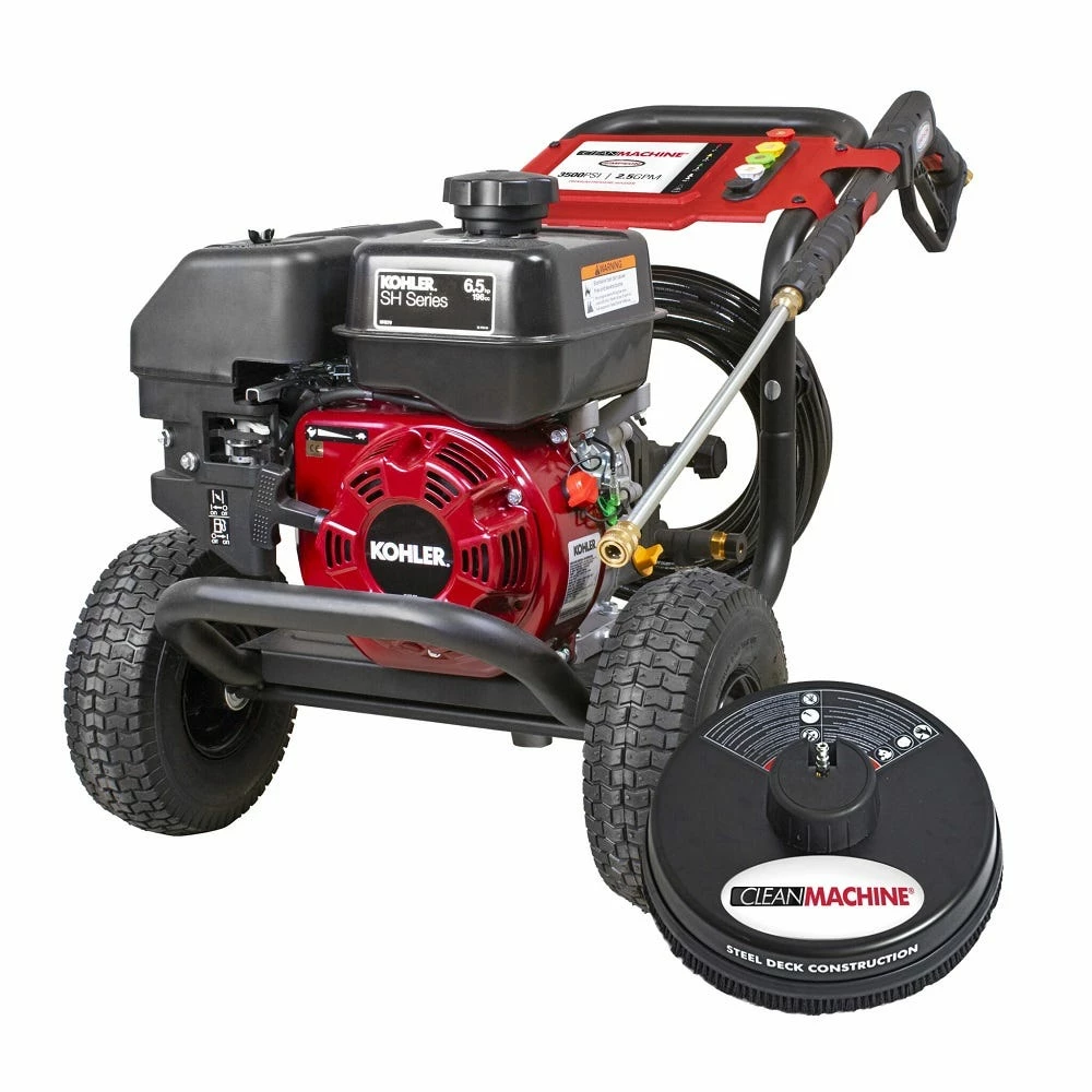Clean big with the Clean Machine by Simpson! This fully assembled compact gas pressure washer is lightweight, easy to store, and provides a powerful pressure washing experience. Just set up and you are ready to clean. The Clean Machine features a KOHLER engine paired AAA AX300 Axial pump with patent-pending PowerBoost Technology provides higher pressure at the nozzle resulting in greater impact and cleaning performance.. The fully assembled pressure washer steel frame is powder-coated for corrosion resistance. This compact gas pressure washer will allow easy access into hard to clean areas.