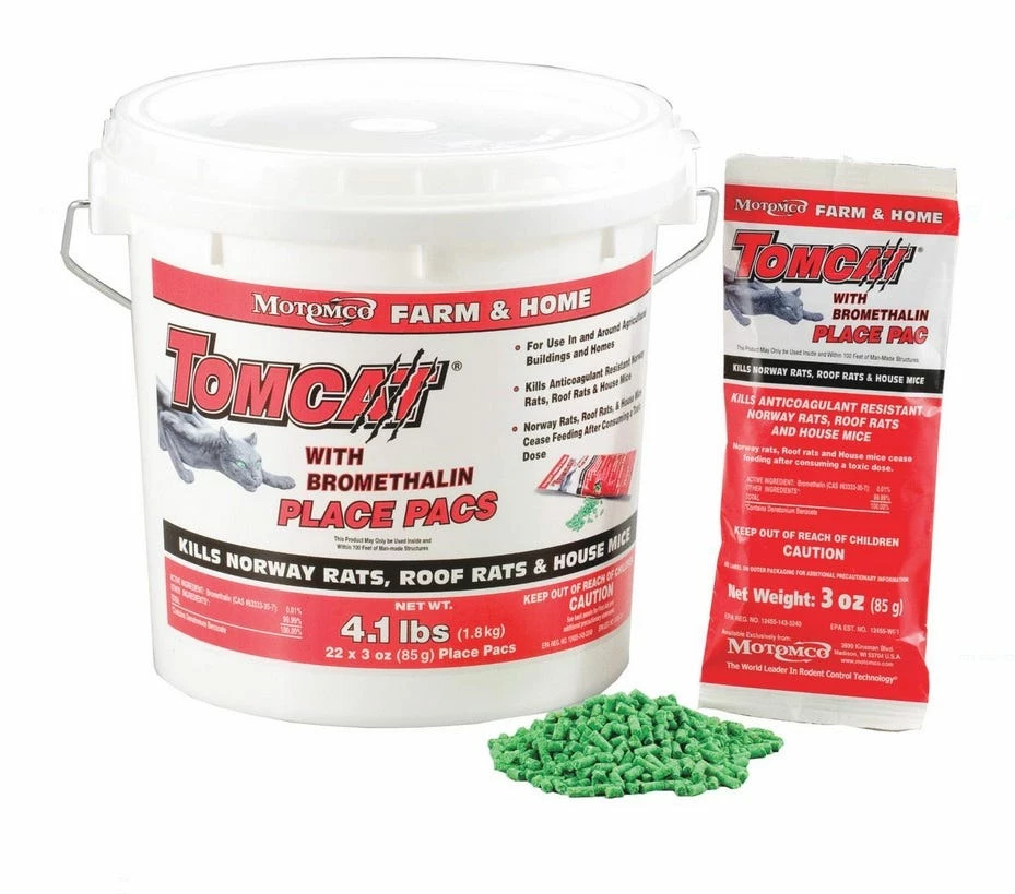 Tomcat with Bromethalin Place Pacs contain the premium active ingredient Bromethalin, excellent for proven control of high rodent populations and severe infestations. Bromethalin is an acute, non-anticoagulant active that will begin to kill rats & mice in 2 or more days, faster than anticoagulant baits. Due to a quick knockdown when compared to anticoagulants, more rodents can be controlled with less bait. Pellets are packaged in individual, pre-measured 3oz Place Pacs, which protect the bait and make it easier to get into tight spaces or hard to reach locations.
