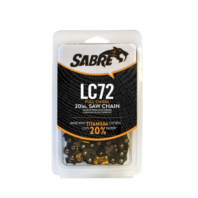 Sabre’s LC72 chain is a full chisel 3/8” pitch chain with hardened, chrome and titanium coated cutters designed for high-speed, excellent chip clearance in clean conditions. Sabre full chisel chain cuts 20% faster than semi-chisel chain. The full chisel chain is preferred by professional users. Sabre chain features the Centri-Lube™ oil distribution system. Centri-Lube™ pulls oil from the bar and distributes to the chain’s rivets reducing stretch, limiting field adjustments, and extending the life of the chain.
