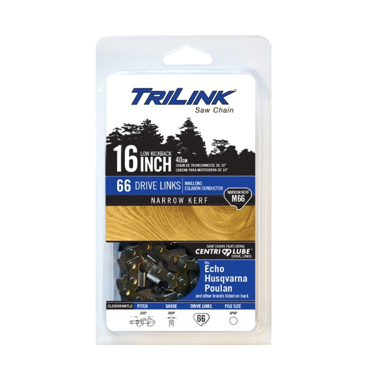TriLink saw chain has chromed cutters for fast, smooth cutting and low kickback design for safety and durability; Please see fit up guide for complete list of compatible chainsaws; Underwriter’s laboratories (UL) certified to American National Standards Institute (ANSI) standards for low kickback safety chain; Centri-lube self-lubricating drive links that enhance chain life and reduce stretch