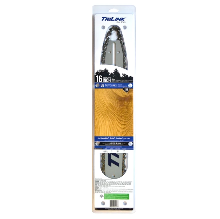 This TriLink 16 in. bar and chain combination features TriLink low kickback (S56) Centri-Lube saw chain. The light weight guide bar is reversible for a long cutting life. The product’s hardened guide bar rails and precision bearings provide long life and smooth chain action along the guide bar.