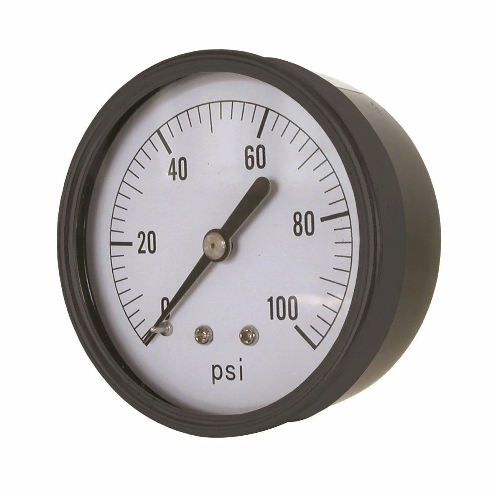 The Valley Industries Universal 100 PSI 2 Inch Dry Back Mount Gauge was designed to be used for applications such as chemicals, fuels, oil and water or any medium not corrosive to brass or bronze. Featuring a brass movement with phosphor bronze bourdon tube. Built with an Acrylic window and ABS standard Steel for increased durability. ¼ Inch MNPT 316 brass male connection. Grade B accuracy. Black enameled aluminum pointer and white background. Fill made of dry material only. Perfect for Master Manufacturing and other branded sprayers.